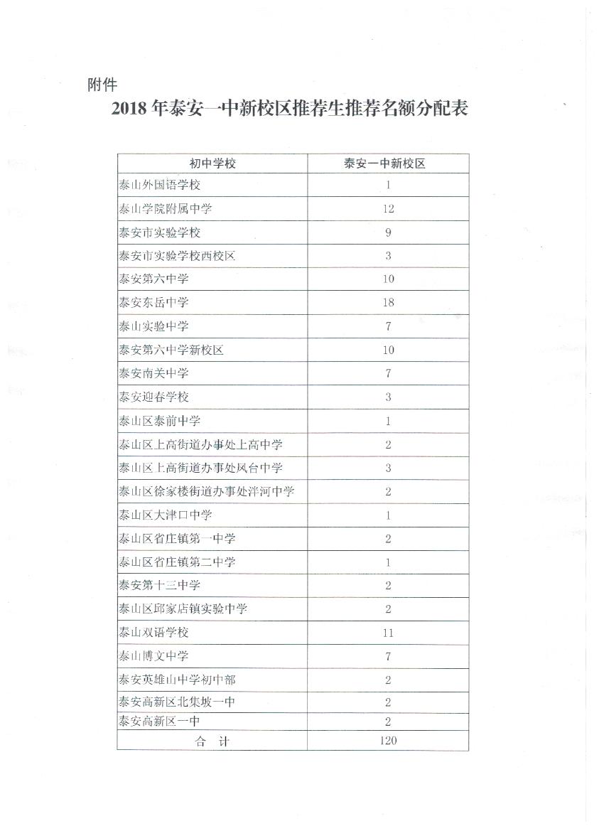 附件:2018年泰安一中新校区推荐生推荐名额分配表