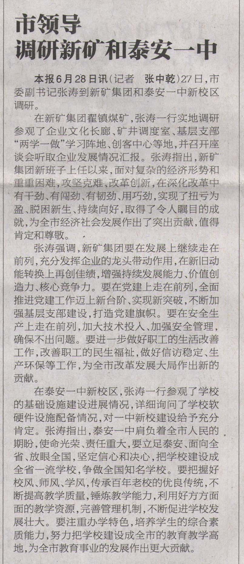 泰安日报:市委副书记张涛到泰安一中新校区调研